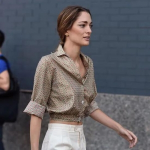 @luciacuesta_ 上面那张是美式贵族style,这张就是嬉皮士style了。Lucia这件印花丝绸衬衫,也是类似人造哑光丝的面料,复古的深色迷幻印花,配上露肤度高的短裤,眼睛更有呼吸的空间,显得造型也更年轻。