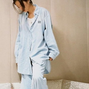 相对于棉质面料呈现的挺括感,倪妮这款亚麻面料更加休闲软糯,蓝与白色叠搭,流露松弛又文艺的风格。